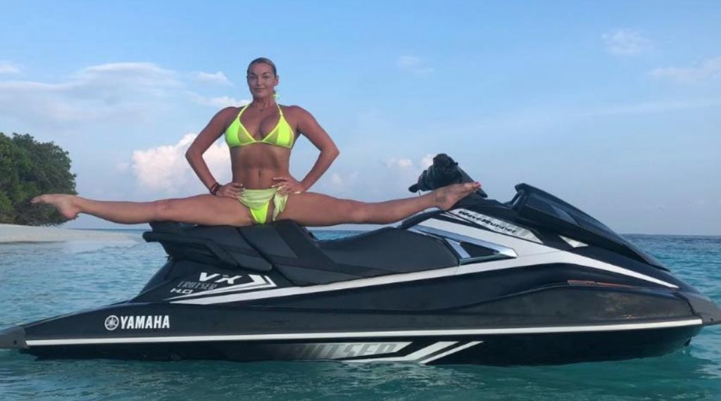 Где только ни показывала свою растяжку королева шпагатов — и на крыше «Майбаха», и на крошечной экзотической лодке туземцев, и возле лошади, напоминает